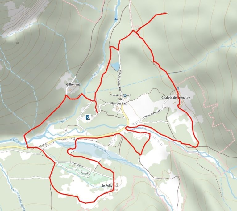 Du parking, rejoindre le pied du sentier qui mène au restaurant du Fer à Cheval et avant de l’emprunter, bifurquer à gauche jusqu’au bout du parking. En suivant le balisage raquette, prendre la direction du village de Giffrenant par une sente d’abord descendante, traversant le Giffre du Fer à Cheval, passant devant un « bélier », (système de pompage permettant de remonter l’eau au village), puis ascendante jusqu’à Giffrenant. Remarquez l’authenticité des fermes du hameau et la vue imprenable sur les falaises du cirque du Fer-à-Cheval. De ce point, redescendre par un large chemin jusqu’au Giffre et la route que l’on traverse. L’itinéraire remonte ensuite le long d’une belle forêt montagnarde et domine les pistes de ski de fond jusqu’à pénétrer dans le second village, Le Pelly. Vous êtes au pied des imposantes barres rocheuses du cirque qui s’étire entre 950 et 2989 m d’altitude au pic du Tenneverge, point culminant du site. Après avoir traversé le hameau du Pelly, le sentier longe le Nant des Pères en rive gauche avant de le traverser puis de le remonter en rive droite à proximité des pistes de ski de fond. On rejoint ensuite un autre torrent, le Nant des Joathons, qui borde les prés du Frénalay. En suivant le balisage raquette, on aboutit au troisième village, Le Frénalay. C’est le petit village savoyard authentique, avec ses soubassements de pierres, ses toits en tavaillons et ses oratoires. Après avoir traversé le hameau, le chemin descend paisiblement au milieu d’une vaste forêt jusqu’à une clairière et une petite mare, puis bifurque pour rejoindre la rive gauche du Giffre et le parking de départ.